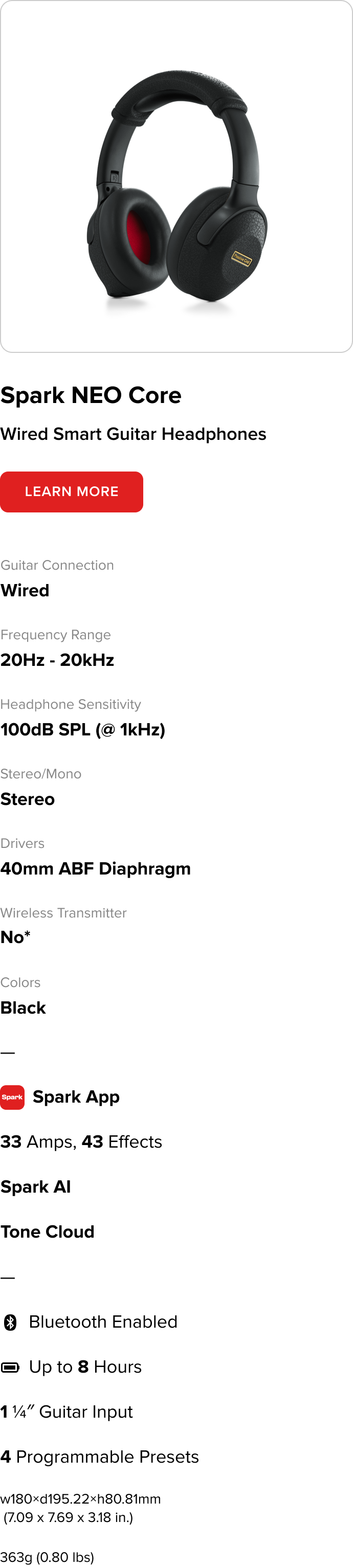 Spark NEO Core is perfect for players who want everything Spark NEO guitar amp headphones offer—immersive tone, smart features, and premium design—at a price that sounds just as good. With the same custom drivers and powerful amp engine, Spark NEO Core delivers the full experience with a simple wired connection. Just plug in and play with most standard guitar cables. (Cable not included.)