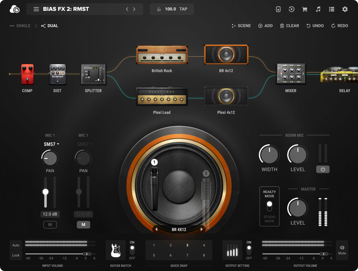 Stocked with cabinets from classic to modern, we’ve harnessed our new DSP engine to craft 10 new custom cabinet IRs, each specifically designed to complement our re-engineered guitar amps. With a streamlined, easy-to-use interface, you can modify mic placement, with a True Stereo mic blend with crystal clear audio and a Reality/Studio mode, which adjusts the output to fit your playing style.