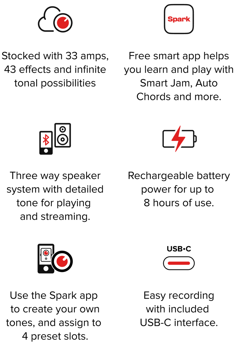 A mind-blowing portable powerhouse, Spark MINI delivers innovative, customizable smart guitar playing to go. With multi-dimensional high-quality sound, a treasure trove of amps and effects, all-new Smart Jam, video creation, and Bluetooth® audio streaming, it’s the biggest smallest rig ever.