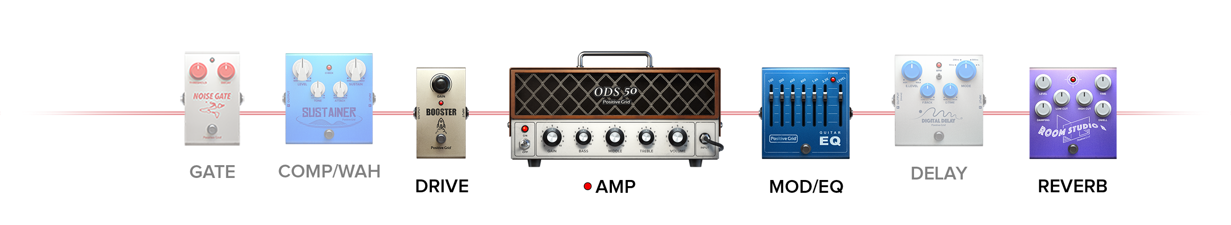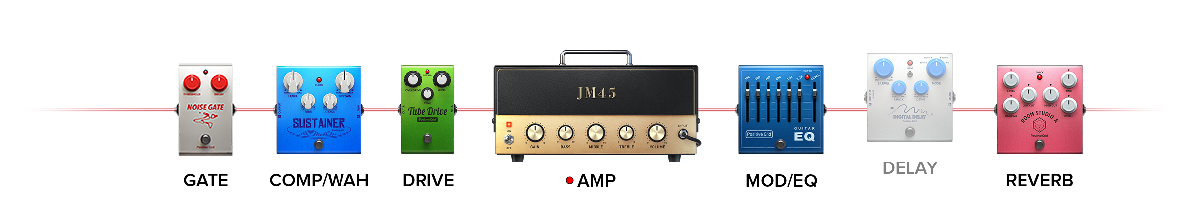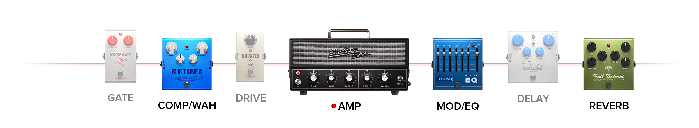 (Noise Gate, Compressor, Distortion, Modulation/EQ, Delay, Reverb)